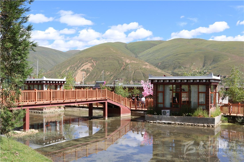 走進山莊,一排排仿道孚民居外觀的房子整齊排列掩映在柳樹間,四面落地玻璃窗的設(shè)計讓陽光溫暖整個房間,潺潺的小溪縈繞其間,不遠處蒼措嘎布海子的蘆葦叢在微風中輕輕擺動,幾只野鴨子在水上嬉戲,特色民居增加了民族韻味,漫步木制棧道,眼前呈現(xiàn)出美麗鄉(xiāng)村的畫卷。