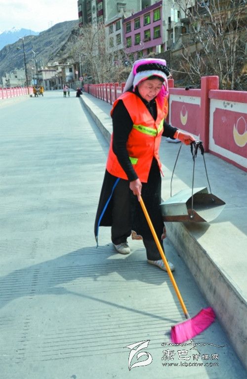 由于丹巴縣城素有風(fēng)城之稱,五條山谷的風(fēng)仿佛都聚集在了志瑪大姐負(fù)責(zé)的濱河路上,風(fēng)的匯聚也成了垃圾的集中點(diǎn),當(dāng)時在分配工區(qū)時,許多清潔工都唯恐這段路落在自己頭上,可志瑪大姐卻主動承擔(dān)起這段路面的清潔任務(wù),每天其他清潔工人還在睡夢中時,她就早早的起床,開始一天的工作。烈日當(dāng)空時,別人都躲在家里乘涼時,志瑪大姐還在路段上來回的巡視,時刻保持路面的清潔。冬日來臨寒風(fēng)呼嘯,城市里的人們都蜷縮在蝸居里開著空調(diào)、電暖氣等,享受著天倫之樂時,志瑪大姐卻穿著厚厚的冬裝,戴著手套在濱河路上費(fèi)力的掃著地,她從來沒有叫過一聲苦,有人勸她放棄這段路,她總是笑著說:“國家給了我工資,我就要好好的干,再說城市如果沒有我們這些清潔工,那市民將會生活在臟亂差的環(huán)境里,將有損丹巴這座美麗小城鎮(zhèn)的形象。”