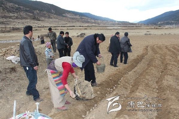 在格中村的田間地頭,到處是一片忙碌的春播景象。雷建平走進斯朗卓瑪?shù)奶镩g,在農(nóng)業(yè)技術(shù)人員的指導(dǎo)下,從選種開始學(xué)起,病害的種丟掉、大的切成幾瓣,撒點底肥,均勻丟種,把蓋種的土弄成一個梯形的壟。雷建平一邊勞動,一邊和斯朗卓瑪攀談,去年土豆收成怎樣?有沒有增加收入?今年春耕生產(chǎn)有哪些實際困難?雷建平又接著向她推薦用地膜種土豆的好處,蓋不蓋膜大不一樣,1畝要多收500-1000公斤,加上上市早,價格也要貴一些,可以到臨近的甲洼鄉(xiāng)江達村去學(xué)習(xí)經(jīng)驗。