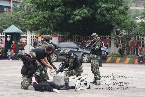 近日,瀘定縣“2014反恐維穩(wěn)處突演練”在瀘定兵站舉行。 來自該縣公安、武警、消防、衛(wèi)生等部門的100余名參演人員以昂揚(yáng)的斗志、精湛的技能,先后演練了盾牌術(shù)、消防滅火、反恐應(yīng)急戰(zhàn)術(shù)、處置群體性突發(fā)事件等科目。此次演練,展現(xiàn)了該縣反恐維穩(wěn)隊伍堅強(qiáng)的戰(zhàn)斗力和優(yōu)良的精神風(fēng)貌,檢驗了反恐維穩(wěn)隊伍的專業(yè)素質(zhì),全面提升了該縣處置突發(fā)事件的能力。圖為演練現(xiàn)場。(周鵬 羅楚凱 袁帥 攝影報道)