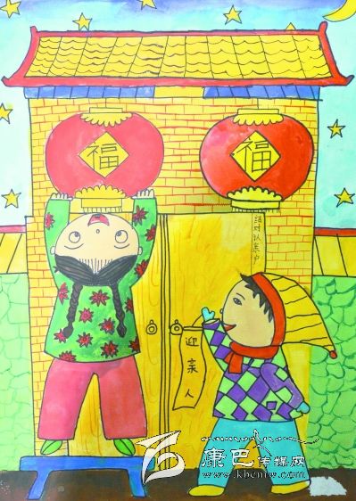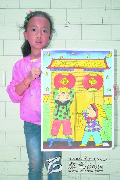 “我和弟弟迎親人”是瀘定縣成武小學二年級學生,周靖蕓同學有感于阿婆家中常有結對認親干部來走訪關心而作的畫。據小朋友自己說:她畫的房子是她阿婆家,掛燈籠的女孩是自己,拿‘迎親人’條幅的是弟弟,畫星星是認親干部有時晚上也會到她阿婆家。(王可富 攝影報道)