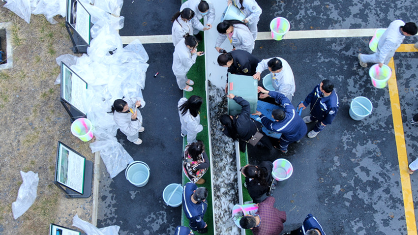 縣農(nóng)牧農(nóng)村和科技局工作人員與市民一起將長絲裂腹魚、短須裂腹魚、四川裂腹魚等魚苗放入雅礱江。