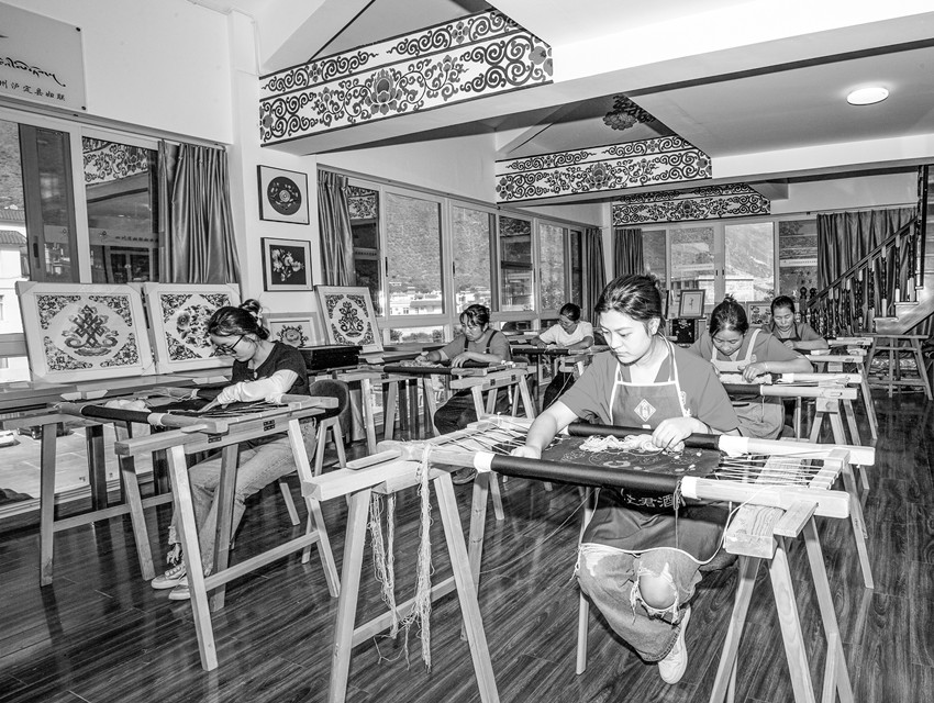 據(jù)烹壩鎮(zhèn)副鎮(zhèn)長(zhǎng)王昇介紹,2018年在省州縣婦聯(lián)的大力支持和幫助下,烹壩鎮(zhèn)成立了“指尖藏花貴瓊刺繡”合作社,150余名婦女加入到合作社,參與刺繡。自從成立了合作社,村里的婦女們背著娃,繡著花,養(yǎng)活自己,養(yǎng)活全家?!爸讣獠鼗ㄙF瓊刺繡”合作社的“貴瓊藏繡”已成為烹壩鎮(zhèn)婦女增收的好項(xiàng)目。婦女們有事做了,干群關(guān)系也更加緊密,老百姓遇到問(wèn)題也更加愿意找黨員、找干部。同時(shí)“貴瓊藏繡”這種康巴地區(qū)特有的非遺傳承技藝也得到了很好傳承和發(fā)揚(yáng)。