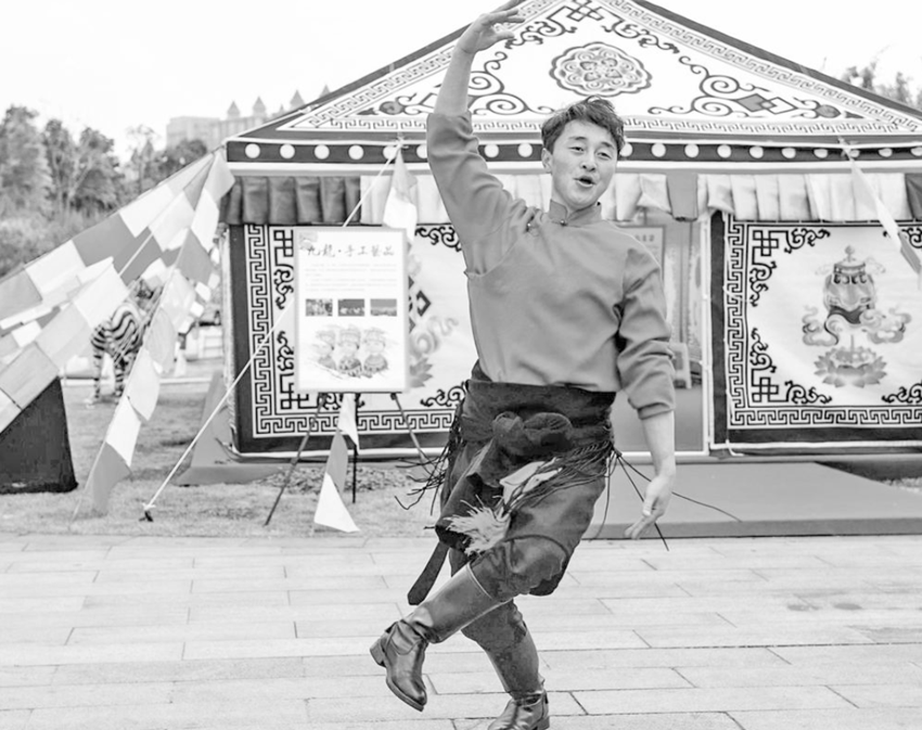 近日,成都青白江櫻花賞花季現(xiàn)場,九龍?zhí)厣a(chǎn)品展銷及文化交流區(qū)中,一群藏族姑娘、小伙正在為游客表演康巴歌舞。由兩名小伙表演的舞蹈《雪域驕子》贏得觀眾陣陣掌聲,他倆粗獷奔放的舞姿,時而化作展翅的雄鷹,時而化作奔騰的駿馬,展示出康巴漢子的熱情、勇敢。其中一位小伙子的表現(xiàn)力很強,深厚的舞蹈功底給大家留下了深刻的印象。他就是來自九龍縣格?;ㄋ囆g(shù)團的演員來讓次稱。
