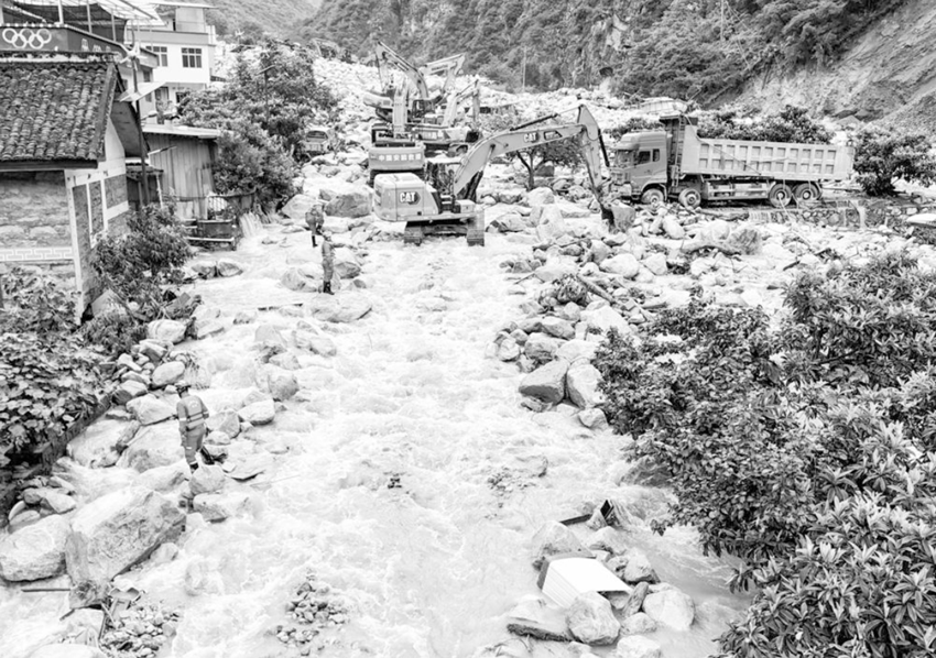 8月4日,在康定市姑咱鎮(zhèn)日地村,救援人員操作機(jī)械疏通國(guó)道318線。 新華社記者 劉坤 攝