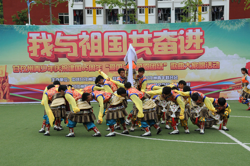 活動中,同學(xué)們先后演唱了《黃河頌》、《我愛您,中國!》、《夢圓中國》等多首紅色經(jīng)典歌曲。你方唱罷我登場,現(xiàn)場氣氛熱烈,高潮迭起。優(yōu)美的歌聲唱出了我青少年的愛國情懷,一面面飄揚(yáng)的紅旗表達(dá)著對祖國的深情祝福。來自州職業(yè)技術(shù)學(xué)校、四川民族學(xué)院、省藏校、甘孜衛(wèi)校、州青聯(lián)委員以及我州著名歌手共1000多人放聲高歌,共同慶祝新中國成立65周年華誕。