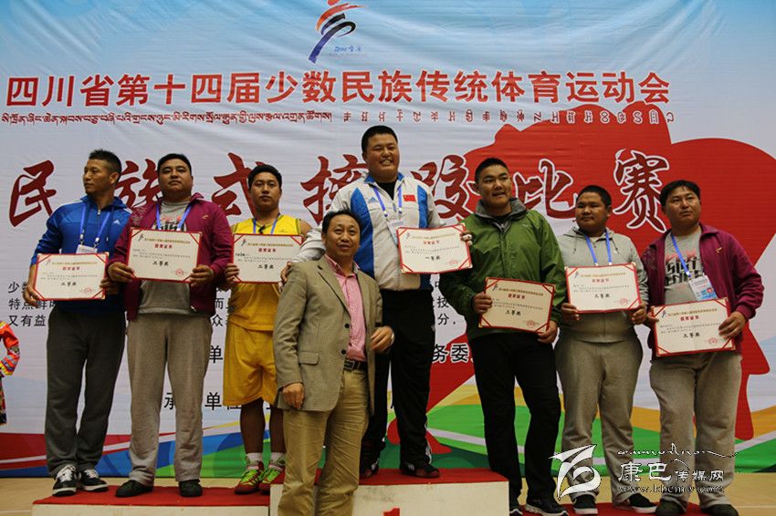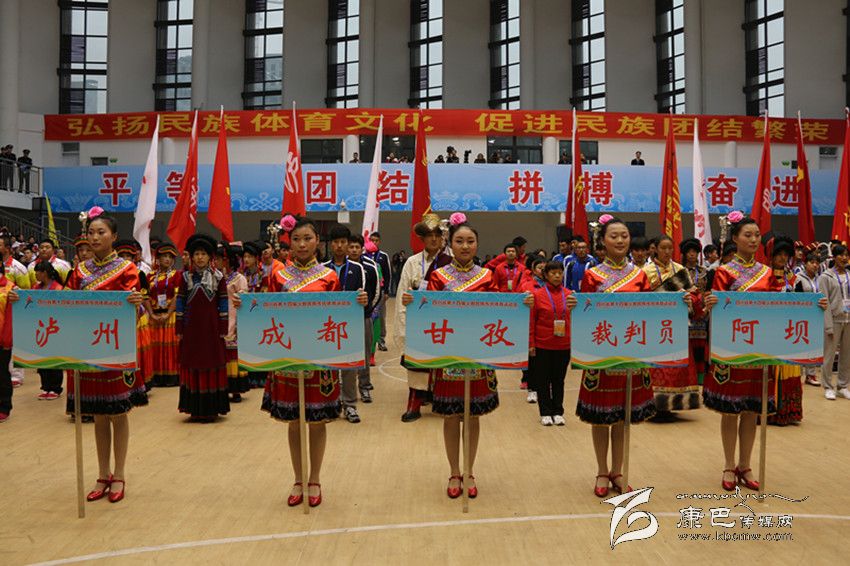 2014年11月4日—9日,四川省第十四屆少數(shù)民族傳統(tǒng)體育運(yùn)動會在宜賓市隆重舉行。在此次民運(yùn)會上,由138人組成的甘孜州代表團(tuán)代表112萬父老鄉(xiāng)親參加了本屆民運(yùn)會射弩、民族式摔跤(格、北嘎、且里西、絆跤)、蹴球、押加、珍珠球、高腳競速、板鞋競速、陀螺、苗族手毽等9個競賽項目和競技類、技巧類、綜合類3個表演項目的比賽。