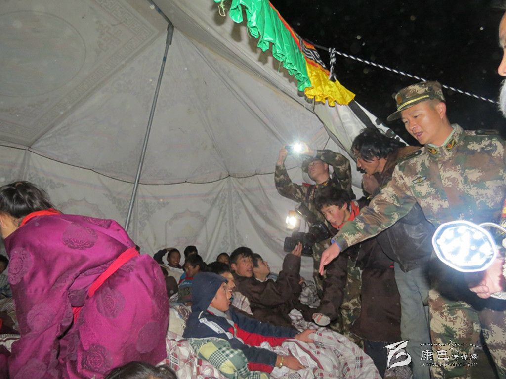 凌晨1時,在江巴村,60名官兵挨家挨戶搜救轉移群眾,連夜搭建救災帳篷。“同志,我的小女兒拉姆找不著了,可能埋在房子里了……”澤仁阿巴急匆匆地拉著武警戰(zhàn)士的手求援,“你家在哪里?快帶我們去!”未等四十歲的澤仁阿巴說完,官兵們奔向不遠處的一堆倒塌的房屋??紤]到有人埋在下面,官兵們不敢用鎬刨用鍬鏟,在另一面墻上石片不停掉落的情況下,仍然紛紛撲下身子扒拉土石結構的殘垣斷壁,最終在兩個木箱中間找到了已哭成淚人的小拉姆,所幸6歲的拉姆安然無恙。