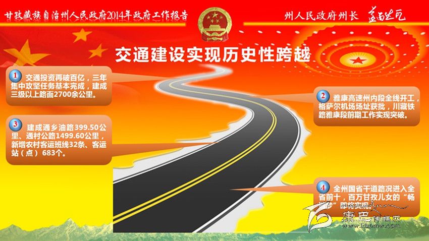 交通建設(shè)實(shí)現(xiàn)歷史性跨越。交通投資再破百億,建成三級以上路面2700余公里。雅康高速州內(nèi)段全線開工,格薩爾機(jī)場場址獲批,川藏鐵路雅康段前期工作實(shí)現(xiàn)突破。建成通鄉(xiāng)油路399.5公里、通村公路1499.6公里,新增農(nóng)村客運(yùn)班線32條、客運(yùn)站(點(diǎn)) 683個(gè)。全州國省干道路況進(jìn)入全省前十。徹底告別無電鄉(xiāng)歷史。完成投資100億元,“電力天路”等項(xiàng)目順利實(shí)施,“川藏聯(lián)網(wǎng)” 工程提前半年建成投運(yùn);18個(gè)縣實(shí)現(xiàn)與主網(wǎng)連網(wǎng);“遠(yuǎn)村點(diǎn)亮”全面完成。城鄉(xiāng)面貌煥然一新。堅(jiān)持建好縣城,全州市政基礎(chǔ)設(shè)施有效提升。堅(jiān)持做大集鎮(zhèn),改造小城鎮(zhèn)危舊房1118戶;投入1.34億元完善姑咱、馬尼干戈、香格里拉、八美4個(gè)省級“百鎮(zhèn)試點(diǎn)”鎮(zhèn)市政設(shè)施,13個(gè)鄉(xiāng)獲準(zhǔn)撤鄉(xiāng)建鎮(zhèn)。堅(jiān)持做美村寨,成功創(chuàng)建45個(gè)省級“美麗鄉(xiāng)村”示范村,19個(gè)州級幸福美麗新村試點(diǎn)建設(shè)全面啟動,打造新村聚居點(diǎn)235個(gè),建成藏區(qū)新居1.11萬戶。全州城鎮(zhèn)化率達(dá)到27%。通信覆蓋越來越廣。完成投資4.53億元,國省干線和主要旅游景區(qū)通信網(wǎng)絡(luò)實(shí)現(xiàn)連續(xù)覆蓋。生態(tài)底色更加鮮明。編制完成《甘孜州生態(tài)文明建設(shè)規(guī)劃》,落實(shí)國家生態(tài)功能區(qū)轉(zhuǎn)移支付資金6.8億元,生態(tài)保護(hù)與建設(shè)工程加快推進(jìn),草原植被、森林覆蓋率分別達(dá)到78%、33.04%。