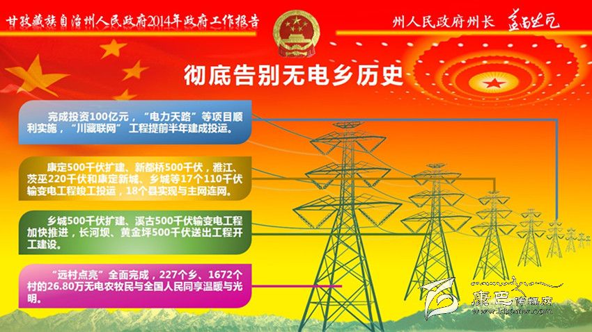 大力推進(jìn)電力通信建設(shè)。投入20億元,加快實(shí)施“電力天路”、無電地區(qū)電力建設(shè)新增項(xiàng)目和農(nóng)網(wǎng)改造升級工程,切實(shí)緩解邊遠(yuǎn)地區(qū)群眾缺電問題;完成長河壩電站500千伏等3個(gè)輸變電項(xiàng)目;統(tǒng)籌抓好表后入戶工程,確保群眾安全用電。投入6億元,新建通信光纜2360公里、基站1025個(gè),解決國省干道、旅游景區(qū)景點(diǎn)信號盲區(qū);新增30個(gè)自然村通電話、545個(gè)行政村通寬帶,出口總帶寬達(dá)到82G。