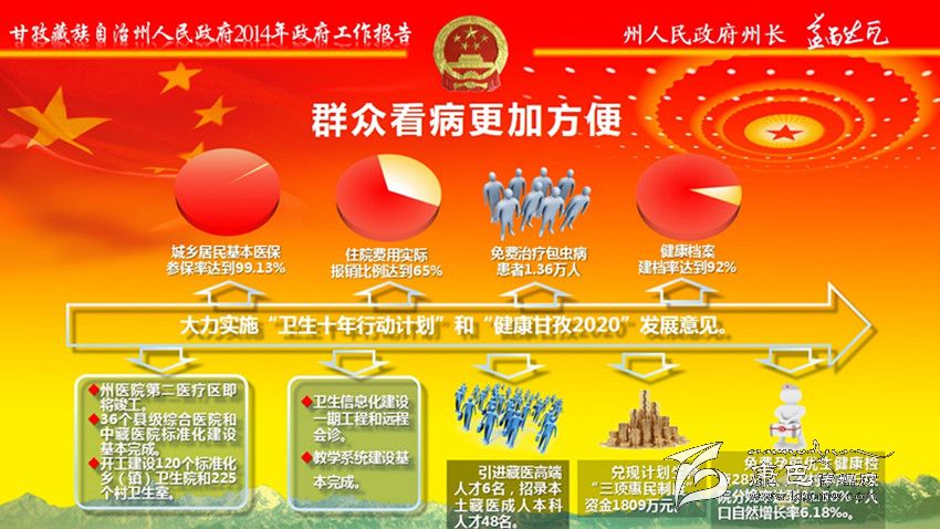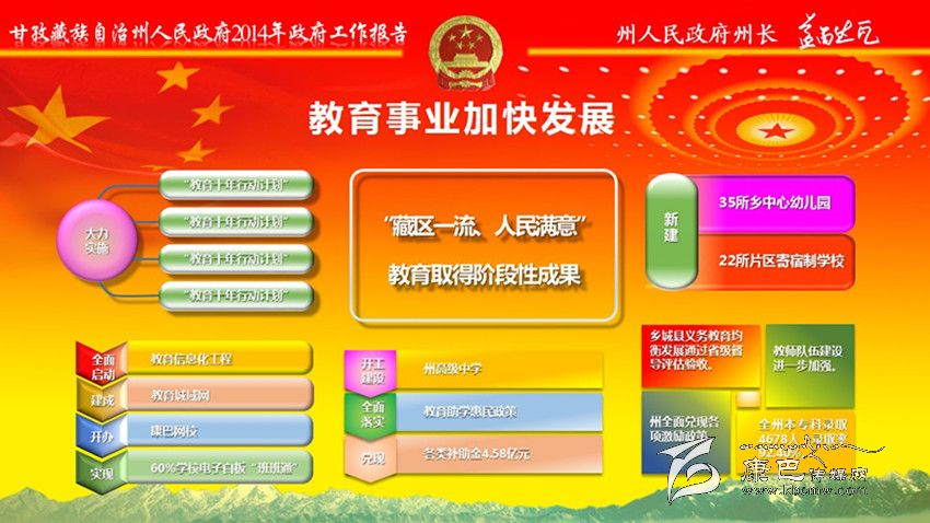 加大民生投入,全年民生支出139億元。全州城鎮(zhèn)新增就業(yè)7400人,城鄉(xiāng)低保實(shí)現(xiàn)應(yīng)保盡保;在全省民族地區(qū)率先實(shí)施醫(yī)療保險(xiǎn)制度城鄉(xiāng)統(tǒng)籌,異地就醫(yī)即時(shí)結(jié)算全面啟動;在全省率先出臺大病醫(yī)療保險(xiǎn)規(guī)定。教育事業(yè)加快發(fā)展。新建35所鄉(xiāng)中心幼兒園、22所片區(qū)寄宿制學(xué)校,州高級中學(xué)開工建設(shè)。全面落實(shí)教育助學(xué)惠民政策,兌現(xiàn)各類補(bǔ)助金4.58億元。城鄉(xiāng)居民基本醫(yī)保參保率達(dá)到99.13%,健康檔案建檔率達(dá)到92%;開工建設(shè)120個(gè)標(biāo)準(zhǔn)化鄉(xiāng)(鎮(zhèn))衛(wèi)生院和225個(gè)村衛(wèi)生室;衛(wèi)生信息化建設(shè)一期工程和遠(yuǎn)程會診、教學(xué)系統(tǒng)建設(shè)基本完成;兌現(xiàn)計(jì)劃生育“三項(xiàng)惠民制度”資金1809萬元。群眾文化生活日益豐富。建成縣“兩館”12個(gè);開工建設(shè)州民族體育館、州農(nóng)牧民演藝培訓(xùn)中心和14個(gè)縣級全民健身中心,建成農(nóng)民體育健身工程739個(gè);開展 “送文化下鄉(xiāng)”近千場;康巴文化研究院“四大工程”全面啟動。深入實(shí)施“百千萬康巴英才工程”,人才科技工作扎實(shí)有效。扶貧移民工作成效明顯。完成1360個(gè)貧困村、19.91萬扶貧對象立卡建檔工作;實(shí)施整村推進(jìn)63個(gè)、連片開發(fā)項(xiàng)目4個(gè)、彝家新寨(村)17個(gè)、索改橋23座,易地扶貧搬遷9850人,2.65萬群眾生產(chǎn)生活條件得到改善。