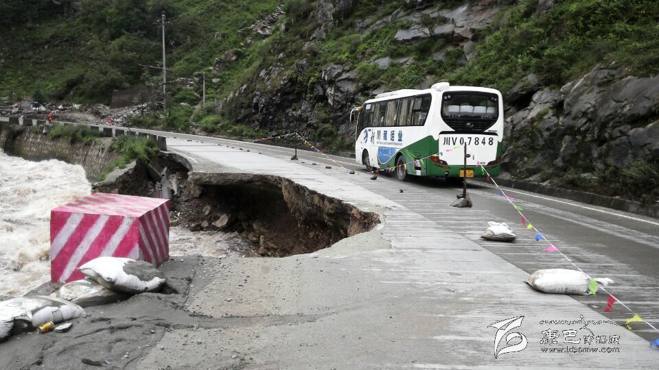 本網(wǎng)訊 (鄧翰卿 賀淑明文/圖)由于連降暴雨,折多河暴發(fā)山洪。9月17日上午7時20分,瀘定公路分局瓦斯溝養(yǎng)護(hù)站在道路巡查中發(fā)現(xiàn)國道318線二康路小天都路段K2824+800處路基被山洪沖毀,形成缺口。發(fā)現(xiàn)險情后,該分局第一時間組織人員對危險路段實行交通管制,安排專人負(fù)責(zé)在缺口上、下方向提示過往行人及車輛,并及時擬定應(yīng)急搶險方案。截止目前,路基右側(cè)被沖毀路段長達(dá)45米,寬5.9米,路基被水漩空,道路混凝土面層懸空15米,僅左側(cè)車道勉強(qiáng)通行。因水流湍急,不利于及時恢復(fù)路基,目前該路段已實行交通管制,該分局提示過往車輛觀察、緩慢通行水毀路段。