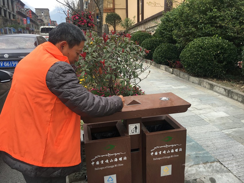 “走,我們到街上逛逛,看看海螺溝的變化?!痹诤B轀暇皡^(qū)管理局政治部主任龔自毅的陪同下記者來到磨西鎮(zhèn)街上。邊走邊看,記者看見龔自毅只要發(fā)現(xiàn)街上有煙頭或垃圾時,就會彎腰把這些垃圾撿起來,扔進(jìn)垃圾桶。