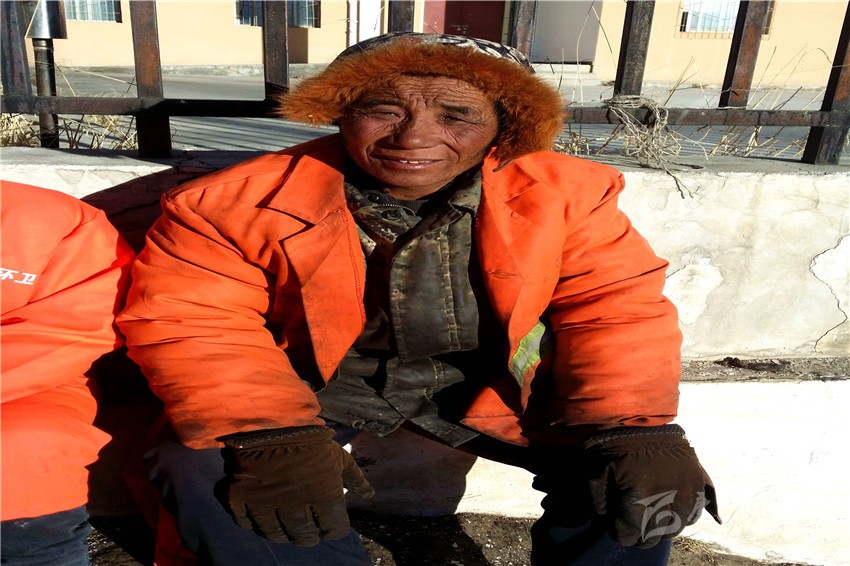 春節(jié)快到了,石渠的最低氣溫已低至零下20余攝氏度,在這呵氣成霜、滴水成冰的季節(jié),大街小巷卻仍然能看見身穿橙色工作服還在起早貪黑地辛勞工作著的人們,他們就是石渠的環(huán)衛(wèi)工人。年近60的澤仁羅布便是其中的一員,雖然他雙頰已被風霜刻畫出道道溝壑,但身體卻很硬朗,閑暇的時候他喜歡和大家在工作的附近找一處陽光充足的地方曬曬太陽、聊聊天。