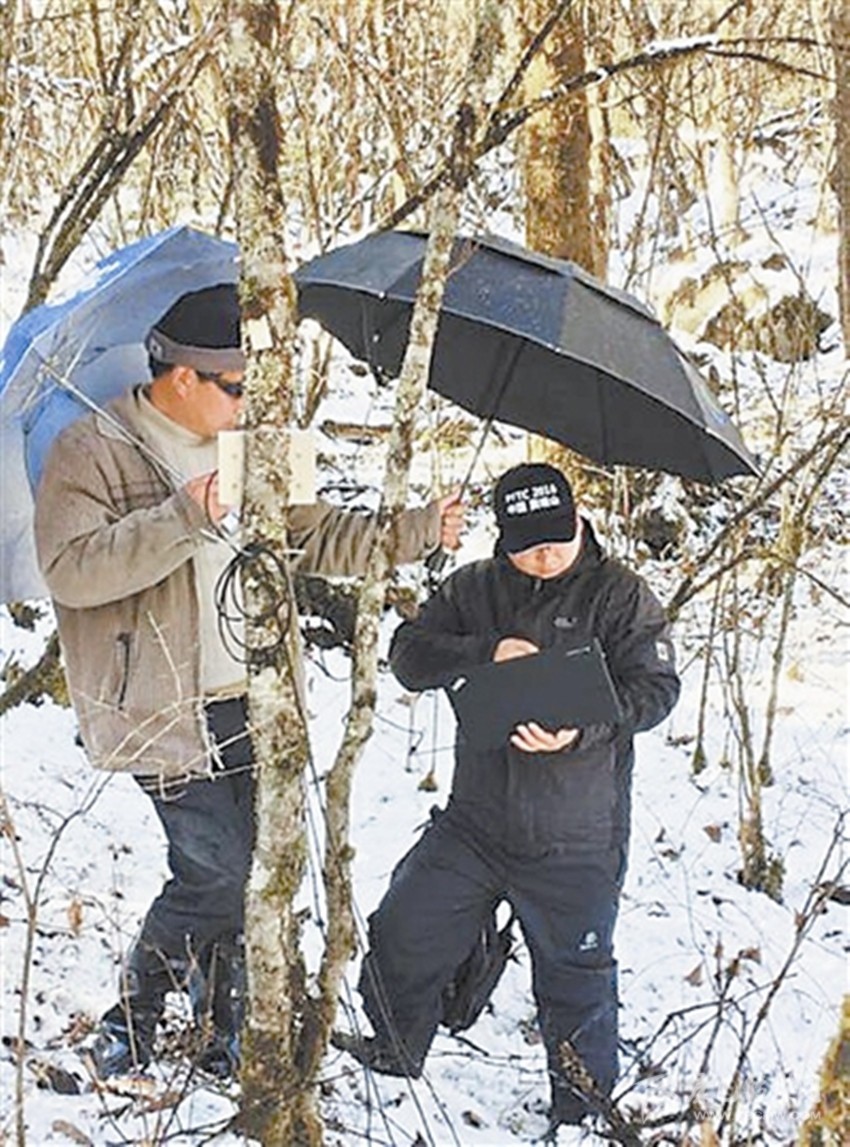 在高海拔地區(qū)進(jìn)行野外作業(yè)時(shí)大雪漫山。