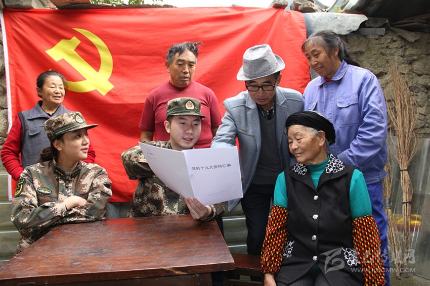 宣傳小分隊(duì)來(lái)到瀘定縣田壩鄉(xiāng)田壩村崗崗組,給村民送上黨的十九大精神宣傳資料和報(bào)刊,與大家拉家常,耐心解讀黨的十九大精神。筆者在現(xiàn)場(chǎng)看到,村民們認(rèn)真閱讀報(bào)紙并聆聽(tīng)宣傳小分隊(duì)的講解。當(dāng)?shù)弥?xí)總書(shū)記在報(bào)告中提出“增進(jìn)民生福祉是發(fā)展的根本目的,必須多謀民生之利、多解民生之憂,在發(fā)展中補(bǔ)齊民生短板、促進(jìn)社會(huì)公平正義”時(shí),該村77歲的老黨員李如瓊拉著官兵的手激動(dòng)地說(shuō):“在黨的好政策引領(lǐng)下,我們過(guò)好日子的信心更足了。”