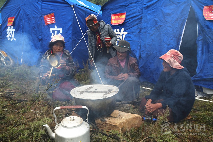 曲珍、曲西和幾個伙伴正在燒著開水?!斑@是到安置點后我第一次生火。前兩天吃干糧喝礦泉水,讓喝慣了酥油茶的我們很不適應。”曲珍說。