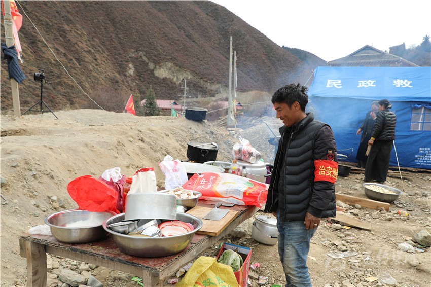根秋尼瑪查看安置點(diǎn)的飲食衛(wèi)生情況。