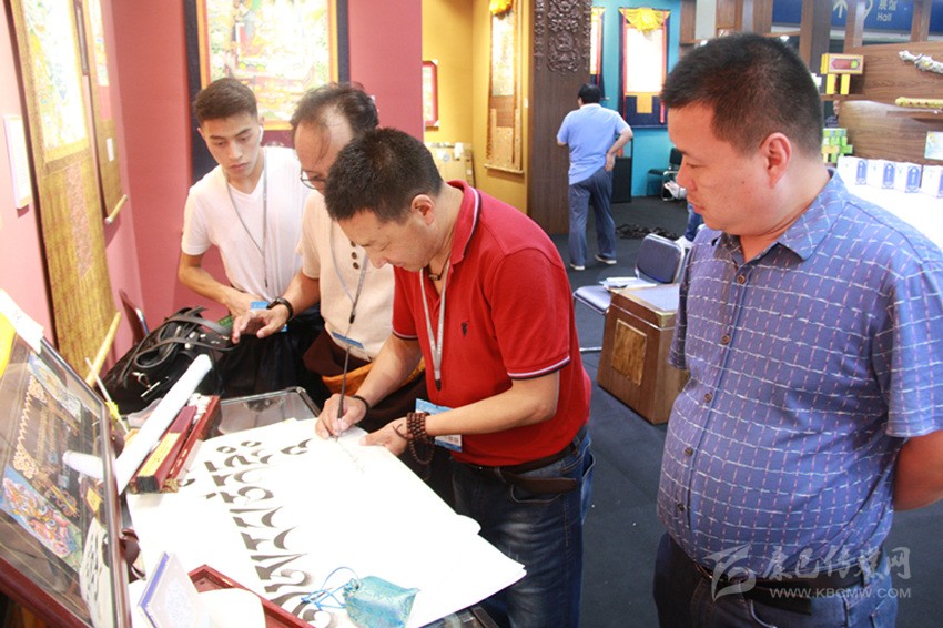 本屆文博會(huì),巴松鄧珠帶來了一件藏文書法作品《格薩爾王》,讓現(xiàn)場觀眾嘖嘖稱贊。孫先生說:“把書法作品用藏族唐卡藝術(shù)的裝裱方式來裝裱,真讓我開了眼界。這件作品圖文并茂,真是太棒了,讓我覺得甘孜這個(gè)地方特別神圣,令人向往。我以后有機(jī)會(huì)不僅要好好練習(xí)藏文書法,還要去甘孜旅游?!?/p>