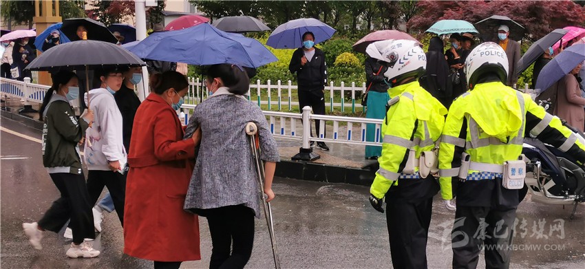 這邊剛幫助考生尋回遺失的準考證,那邊一名杵著拐杖的考生引起了執(zhí)勤交警的注意,這時這名考生在家長的攙扶下正準備過馬路,交警見狀,立即上前為其疏導(dǎo)交通,開辟出綠色通道。記者了解到,這名考生叫段尚玲,兩周前意外摔傷了腿,這給她的應(yīng)試之路帶來了不少麻煩,幸好在交警的幫助下,她安全順利地進入了考場。