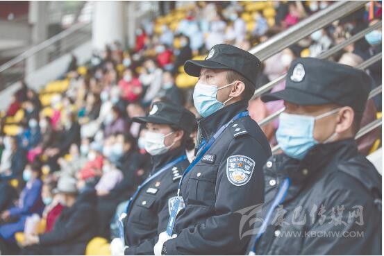 “請(qǐng)出示你的身份證,配戴好口罩?!薄按蟾缒阏义e(cuò)方向了,你是往那邊走?!薄鞍荩愕奈恢檬峭筮呑??!薄诒遍T體育場(chǎng),民警除了安保執(zhí)勤以外,還幫助行動(dòng)不方便的群眾找尋座位,或?yàn)樽稍兊娜罕姶鹨山饣蟆?/p>
