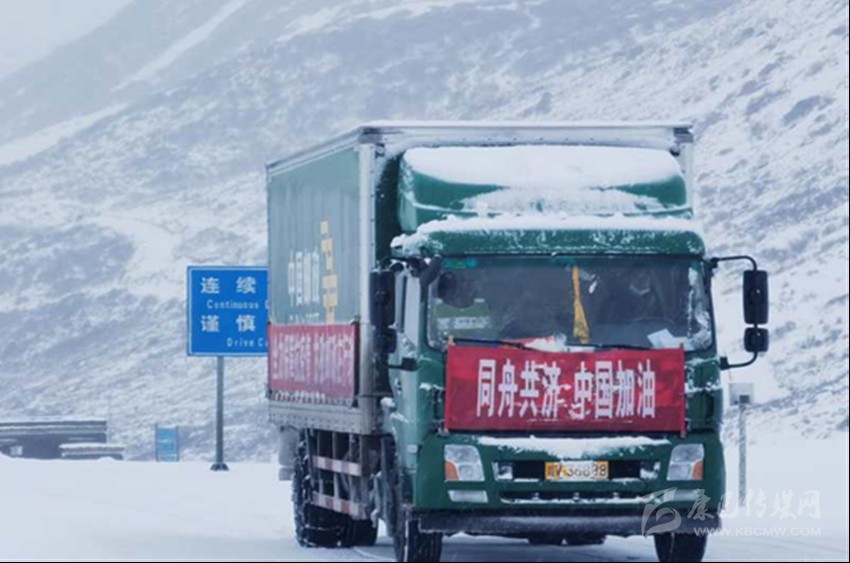 圖為甘孜郵政頂風(fēng)冒雪逆行為八美鎮(zhèn)運(yùn)送防疫物資。