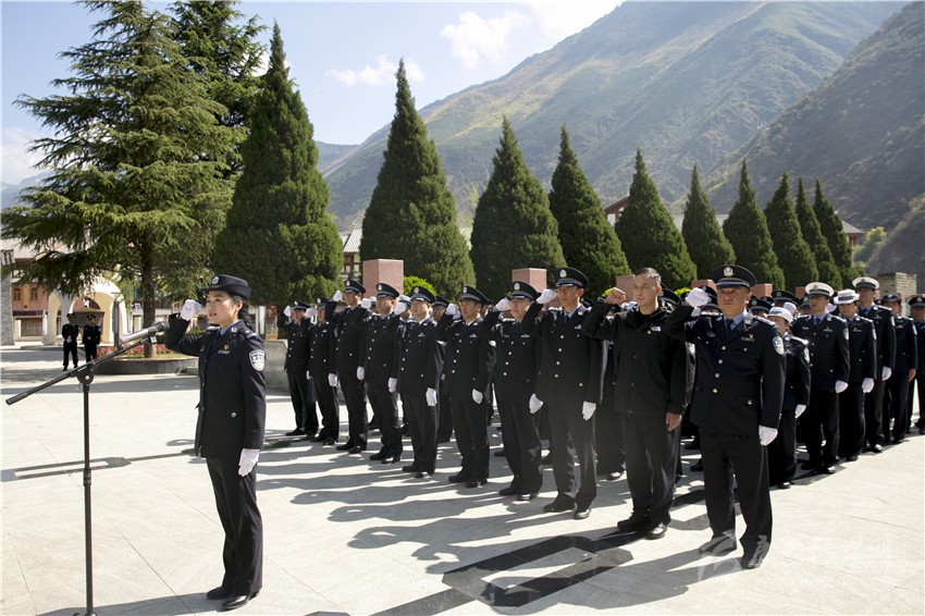 州政府副州長、州公安局長李強(qiáng)率參與民警向紅軍飛奪瀘定橋紀(jì)念碑敬獻(xiàn)花籃,莊嚴(yán)鞠躬,表達(dá)沉痛哀思。在紅色圣地,民警們還面對鮮紅黨旗,舉起右拳,重溫入黨誓詞,向革命烈士致以最崇高的敬意。