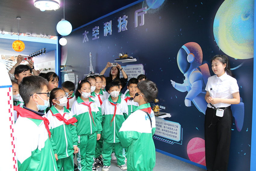 “航天夢(mèng)是中國(guó)夢(mèng)、華夏夢(mèng),神舟十六號(hào)載人飛船發(fā)射成功并進(jìn)入預(yù)定軌道。古人仰望星空,幻想上天攬?jiān)碌膲?mèng)想,在一代代中國(guó)航天人的努力下逐漸變?yōu)榱爽F(xiàn)實(shí)?!薄凹t領(lǐng)巾”講解員劉嘉沐在解說他負(fù)責(zé)的天空科技廳時(shí),將這一喜訊分享給了在場(chǎng)的同學(xué)們?!跋M芙枭裰凼?hào)載人飛船發(fā)射成功的機(jī)會(huì),在科普周活動(dòng)中普及航天知識(shí),讓更多的學(xué)生深入了解航天文化,引導(dǎo)青少年傳承航天精神、點(diǎn)燃航天夢(mèng)想?!敝菘茀f(xié)負(fù)責(zé)人告訴記者。