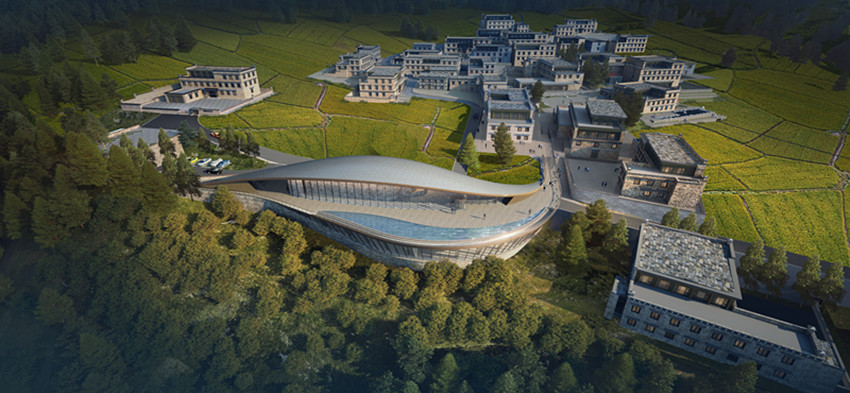 “這個(gè)香巴拉文化博物館模擬了‘吉祥八寶’之一的白海螺形態(tài),朝村莊一側(cè)是從地面延伸而成的體量,共分3層,總高度17.4米,總建筑面積2994.6平方米?!敝薪ò司治髂辖ㄔO(shè)工程有限公司項(xiàng)目總工喬興國向記者介紹,香巴拉文化博物館朝村莊一側(cè)是從地面延伸而成的體量,自然地融于山林中,朝山谷一側(cè)通過水面反射回應(yīng)壯麗雪山。