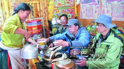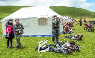 位于宗塔草原“大盆地”東邊山坡的降巴牧場在隊員們的心里也留下了深刻的印記。15日早上5點半隊員們就出發(fā)上了降巴牧場。朝霞映紅了天邊,紅云罩著青草牛糞味飄香的草坡。比采風(fēng)隊員們起得更早的牧人已擠完了牛奶,一個僅10 歲的女孩正在草坡上拾牛糞;牛毛帳篷里,勤勞的牧婦已打開了牛奶分離器開始分離酥油了……一問,方知牧民們今晨4點就起床勞作,干完早上的活兒,他們要趕到三公里遠的“盆地”耍壩子,看賽馬。這個牧場靜謐潔凈得令人稱奇,青青的草坡上絕少有垃圾存留,沒見到一只兇惡的牧犬;按季節(jié)劃分的草場由整潔的網(wǎng)圍欄圈開,分隔有致;牧人舉家出門,連帳篷門也不掩,據(jù)說這里沒有偷盜發(fā)生,家人和諧;古老、平和的氣氛中,晨風(fēng)輕拂,野花青草搖曳,輕柔的晨霧中偶而傳來兩聲牛哞,讓人頓感心靜如水。對于長期居住城市的人來說,這里無疑是“幽雅天堂”了。