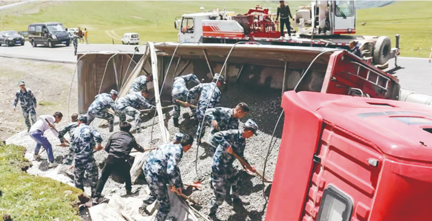 官兵營(yíng)救側(cè)翻車(chē)輛。