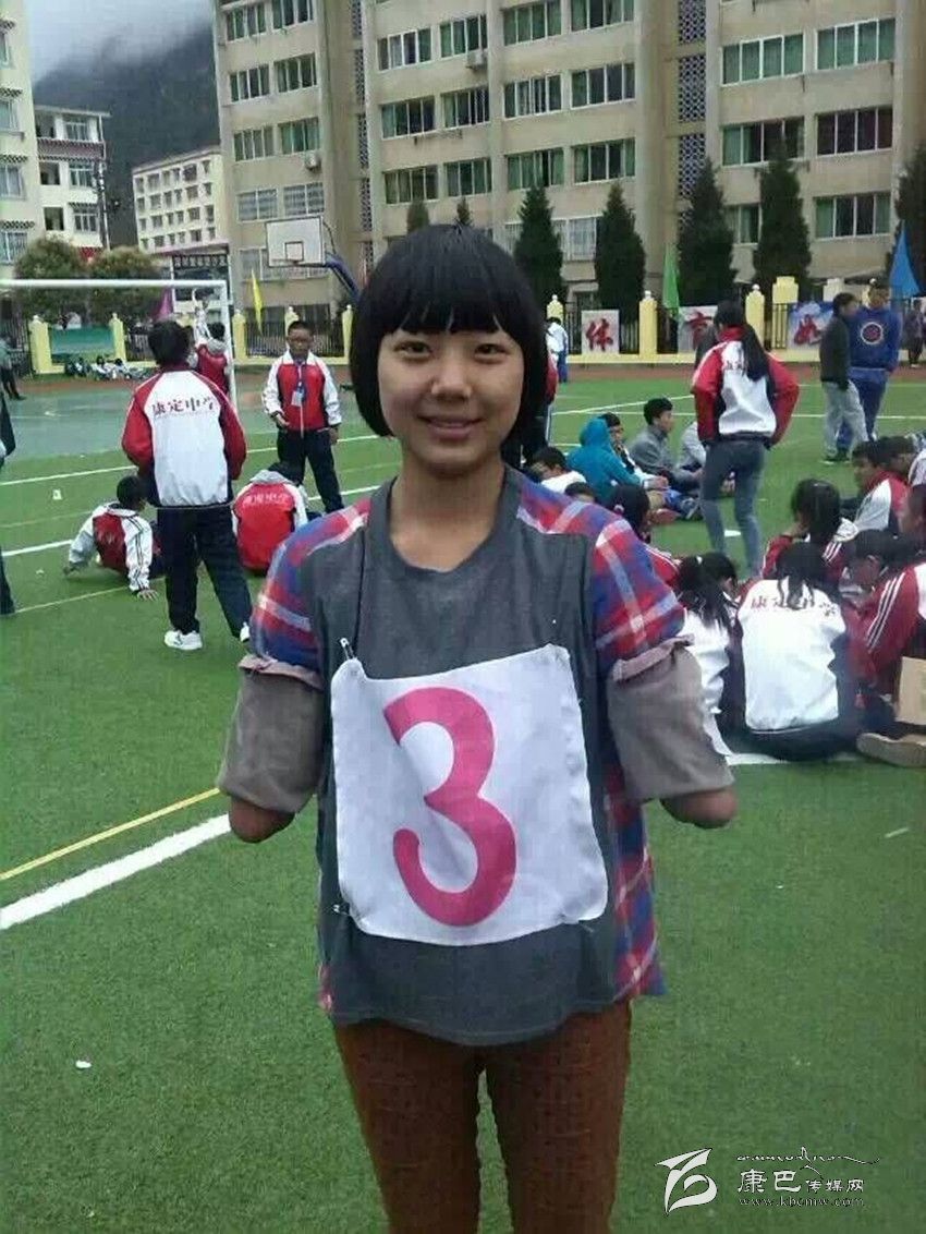 在康定中學校園里,你會邂逅這樣一位女孩:臉上永遠燦爛著陽光般的微笑,雙眼永遠閃爍著自信樂觀的光芒。教室里,她聚精會神地聽課;圖書館里,她專心致志地讀書;操場上,她身輕如燕地奔跑;寢室里,她開心爽朗地和同學交流??赡阕屑氁豢?,她竟然沒有雙臂,就像折翼的天使。她就是該校高2016屆8班學生,羌族女孩許方燕。行走在高原的風中,她是一幀讓每一個人內(nèi)心泛起感動漣漪的美麗風景……