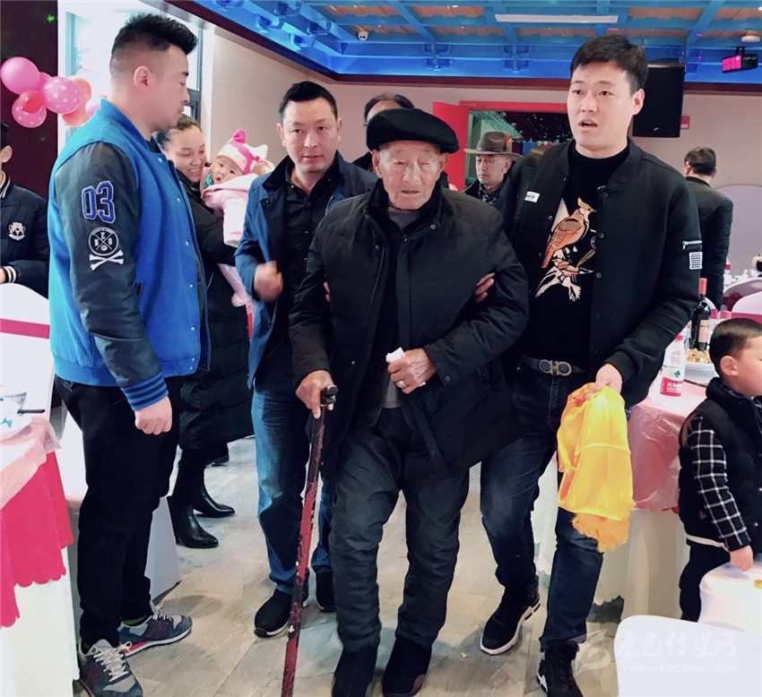 3月5日,在瀘定縣烹壩鄉(xiāng)十里香酒店,按照當(dāng)?shù)貍鹘y(tǒng),王瑞生的兒孫們提前為他隆重過百歲大壽。雖然已近百歲高齡,但王瑞生精神矍鑠,思路清晰,談吐自如,面色紅潤的他身著簡樸,胸前始終戴著2016年由中共中央、中央軍委頒發(fā)的“中國工農(nóng)紅軍長征勝利80周年紀(jì)念章”,接受親友們的祝福?!白D】甸L壽,開開心心”。親人們不絕于耳的祝福,老人心滿意足,笑容滿面?!昂?,好,我的家人團(tuán)圓和睦,家庭幸福,是我最大的心愿?!比缃瘢先艘咽撬氖劳?,家人濟(jì)濟(jì)一堂,親情流淌,老人幸福開懷。