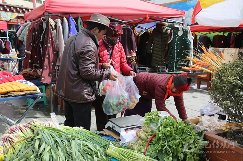 記者看到,集市上圍滿了背著背簍采購年貨的群眾,他們有的拿著新款式的藏裝比來比去,有的對(duì)著圖案豐富的藏毯左挑右選,有的在購買商品“犒勞自己”,有的在為后輩“獻(xiàn)著愛心”,大家都在選購著心儀的年貨。
