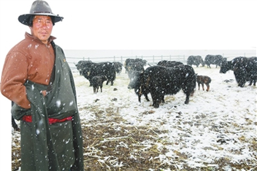 5月8日,甘孜縣達通瑪片區(qū)大雪飛揚。在茶扎鄉(xiāng)銀多村集體牧場,放養(yǎng)人員格絨正在給上百頭牦牛喂草料,他喜滋滋地說,通過牧民儲備和農牧農村局提供草料的方式,牦牛可以安全過冬。銀多村現(xiàn)代化集體牧場合作社成立一年多的時間,共出欄牦牛16頭,總收益67380元,除去20%預留金,村民有了一定的收入,而作為放牧人員,他管理了52頭牦牛,一年有1.2萬元的收入。
