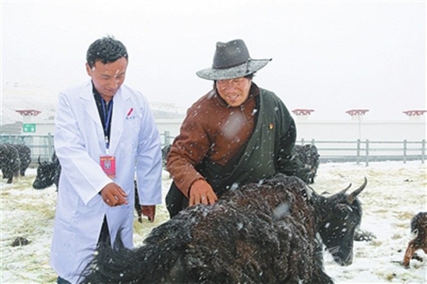5月8日,記者驅車來到距離甘孜縣城80公里的茶扎鄉(xiāng)銀多村集體牧場,在草料儲備倉庫,飼養(yǎng)員格絨正在給牦牛準備草料,而獸醫(yī)則在圍欄里逐一巡診牦牛。