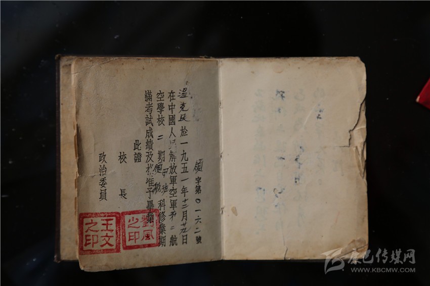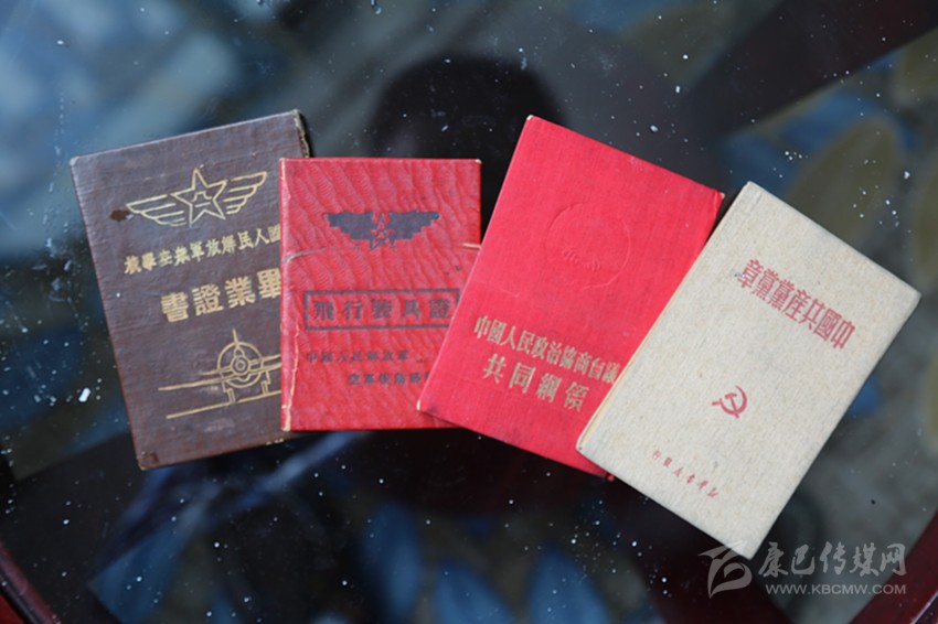 溫克棟的大兒子、57歲的溫樹平拿出大伯留下的遺物——一本中國人民解放軍航空學(xué)校畢業(yè)證書、一本中國人民解放軍空軍后勤部發(fā)的飛行裝具證、一本《中國共產(chǎn)黨黨章》、一本《中國人民政治協(xié)商會(huì)議共同綱領(lǐng)》,四本珍貴的文物書頁發(fā)黃,有的還有些微殘缺,但卻是珍貴的歷史見證物,溫家視為傳家寶。