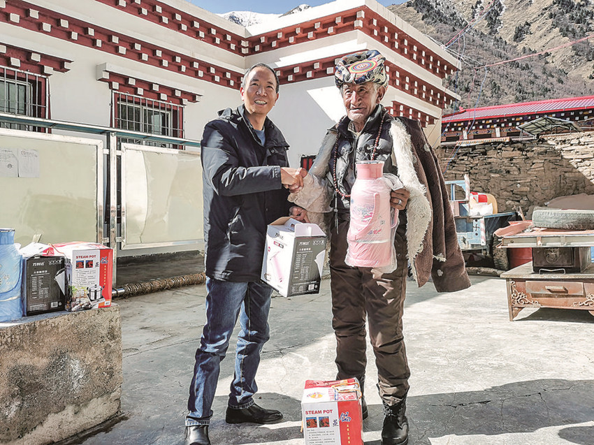 戴林為自己的結(jié)對“親人”送慰問品。