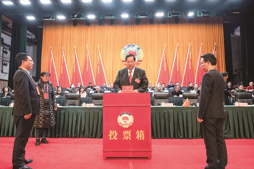 州政協(xié)委員在選舉大會上投下莊嚴(yán)的一票。