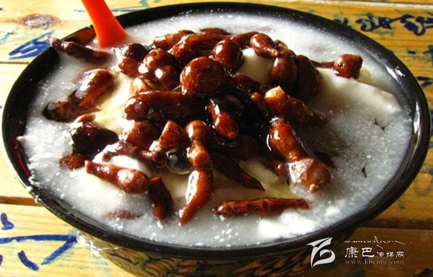 人參果飯也叫“卓瑪折絲”。將人參果煮熟后,放在米飯上面,細(xì)細(xì)地撒些白糖,再均勻地淋上一勺滾燙的酥油汁,一份營養(yǎng)又好吃的人參果飯就做好了。人參果飯被藏族同胞視為一種吉祥的食物,只在婚禮、節(jié)日食之,以之待客,視為尊貴之意。在隆重的藏歷新年,人參果飯會被盛在一個(gè)小巧精致的盛器內(nèi),供于佛龕前。