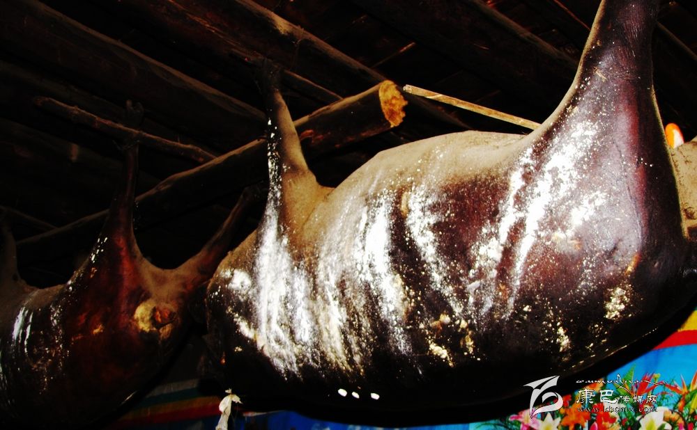 “臭豬肉”的制作過程和來歷:豬用玉米和麥子喂肥后,用繩索套豬頸勒死,在其胸開一小口將豬心血脈弄斷,使肉中的血全部流回到內(nèi)臟中,再把所有的內(nèi)臟從小口中取出,并填上青稞、麥子等谷物后縫合,再用灶灰和紅土塞住七竅,把氣吹脹,埋在麥糠中10余天吸干水,取出掛在灶上的房梁上自然煙熏數(shù)年即成。其懸掛年限可達(dá)10年以上,最長的可達(dá)30余年。食用時(shí),隨用隨取,做法也很多,可生吃,可煮食,也可熬湯。扎壩人多愛生吃,初嘗入口難適,多食后方覺滿口濃香,回味無窮。過去是為防備戰(zhàn)事而儲備食品,后來就逐漸成為當(dāng)?shù)氐囊环N飲食習(xí)俗和主要食品了。