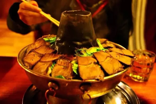 所用的鍋很像北京的紫銅鍋,但吃法并不像其他的火鍋一樣涮著吃,而是直接把牦牛肉和各種菜品一起堆在鍋里,像一座小山丘。