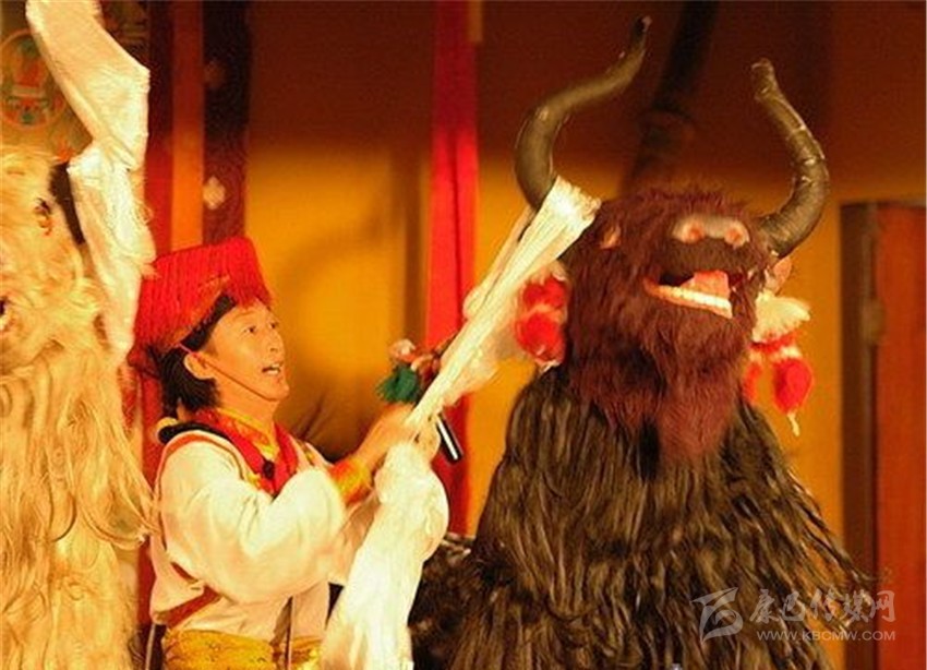 之后,由演員扮演的牦牛會(huì)上場(chǎng),牦牛由兩個(gè)演員扮演。一黑一白兩頭牦牛。關(guān)于白牦牛和黑牦牛的象征意義,說法不一,有的說白牦牛象征前藏地區(qū),黑牦牛象征后藏地區(qū);有的說白牦牛象征溫順和善良,黑牦牛象征勇猛和彪捍。