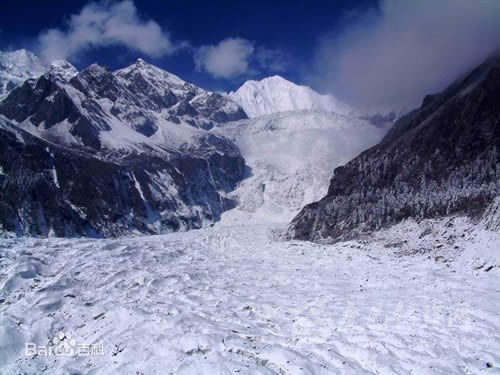 沿冰川上行三公里,繞過黑松林,即可望見這條大冰瀑布。冰瀑布寬達(dá)1100米,落差1080米,由無數(shù)極其巨大的光芒四射的冰塊組成,仿佛從藍(lán)天直泄而下的一道銀河。除非你親眼見到,沒有任何詞匯能形容它的瑰麗笥偉大。冰川最高點的海撥為6750米,而最下端的海撥高度僅為2850米,它不但是低緯度低海撥的冰川,而且是落差最大的冰川。